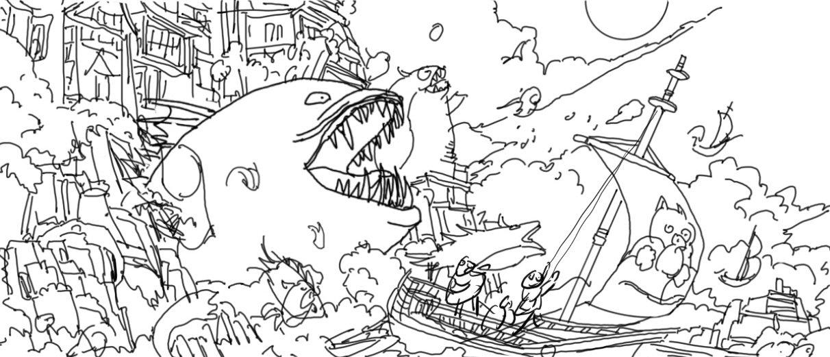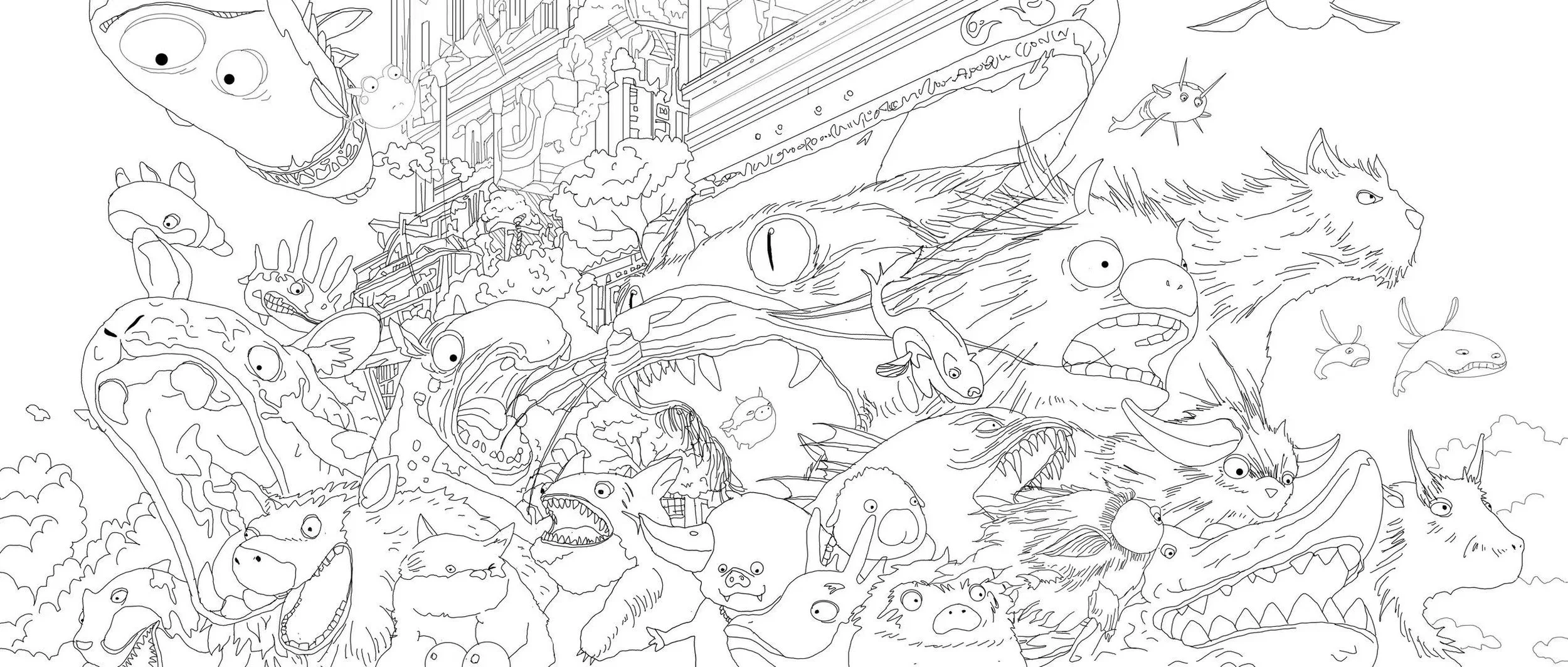 It's inspired by “Where Wild Things Are”. Many monsters get together, centered on the blue cat monster in the middle. They all present an interesting image with their heads turned outwards and their mouths wide open. Above them is a boat belonging to Max - the main character, as well as dense woods and houses.